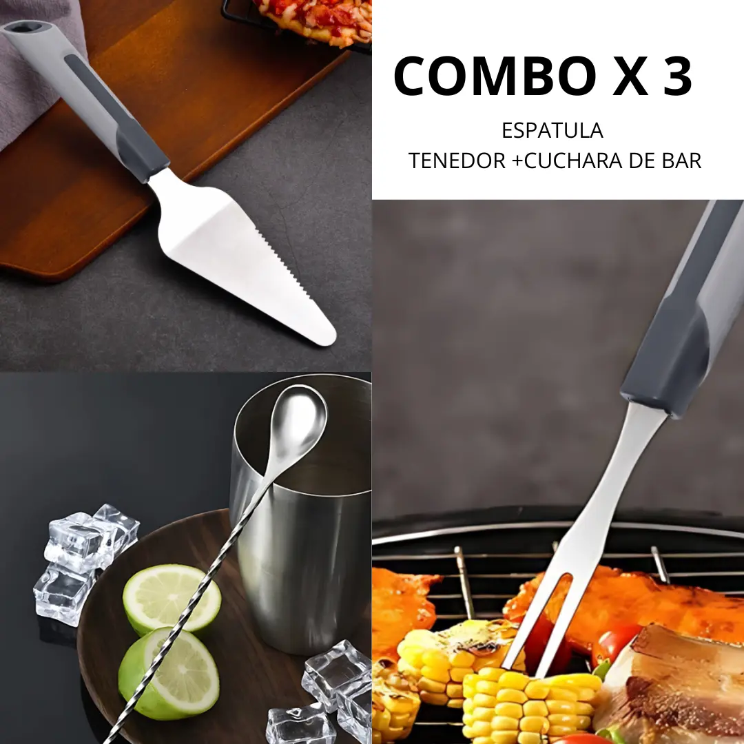 Incluye una cuchara de bar para mezclar tragos como un bartender, un tenedor parrillero resistente para manejar carnes con firmeza y una espátula premium perfecta para dar vuelta, servir y cocinar sin esfuerzo.Todo hecho con acero de alta calidad, diseño ergonómico y pensado para durar.
