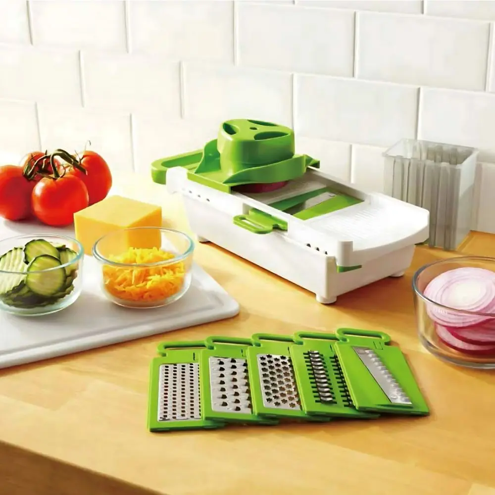 Fácil de usar: la cortadora está equipada con una base de contenedor de alimentos antideslizante, que puede almacenar las verduras y frutas cortadas en categorías, reduciendo el desorden en la tabla de cortar de la cocina, de modo que a veces ni siquiera necesita una tabla de cortar.